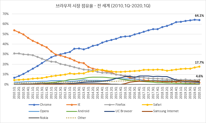 이렇게 새롭고 다양한 기술을 선보이는 에버그린 브라우저들을 전 세계 사람들이 사용한다면 개발자 입장에선 가장 편리할 것이다. 하지만, 사람들이 선호하는 부분이 다르듯이 브라우저 점유율에서도 다양한 추이를 보여준다. 또한 각 브라우저마다 사용하는 개발 언어가 달라서 코드가 일관적이지 못하는 경우가 발생한다. 이 뿐만이 아니다. 우리가 위의 점유율 그래프에서 주목해야 할 부분은 바로 구형 브라우저의 점유율이다. 대표적으로 Internet Explorer(이하 IE)는 2020년 3월 기준 약 3.47%이다. 대한민국만 한정하면 13.7%인데, IE의 가장 큰 문제는 새롭게 도입된 ES6 사양을 약 11%밖에 지원하지 못한다. 쉽게 말해, IE를 포함하여 구형 브라우저들은 기본적으로 ES6 이상의 최신 사양을 사용하지 못한다는 의미다.