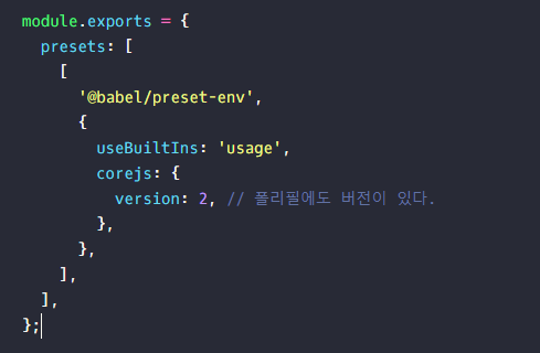 IE에서 Promise를 인식하지 못한다는 것을 알았다. 이렇게 Babel에서 변환하지 못하는 것들을 작동시키기 위해 '폴리필'이라 부르는 코드 조각들을 추가하여 변환작업을 해결한다. 이전에 작성한 babel.config.js 파일에서 폴리필 옵션을 추가해보자. 일단 env 프리셋만 적용한 상태라고 가정하자.