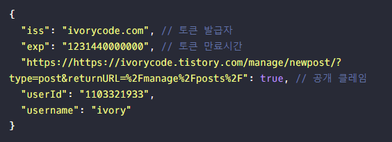 등록된 클레임은 토큰 정보를 표현하기 위해 이미 정해진 데이터 종류이며, 모두 선택적으로 작성 가능하다. 종류는 아래와 같다.