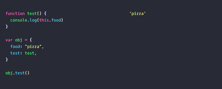 이렇게 하여도 obj객체의 값을 상관하지 않고, 전역 상태의 값을 바인딩하게 되어 pizza가 아닌 다른 값을 호출하게 된다.