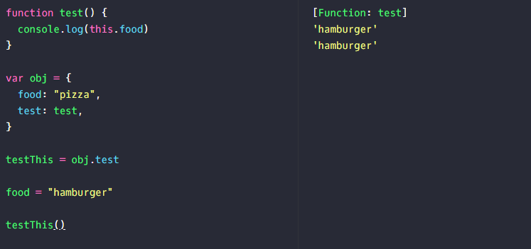 처음에 작성한 코드와 같이 obj프로퍼티에 함수를 할당했다. 하지만 testThis에 레퍼런스를 저장했더니 pizza가 아닌 hamburger를 호출하고 있었다. 아까 this의 동작 방식을 설명할 때, 기본 바인딩을 기억하는가? this는 기본적으로 전역 객체를 가리킨다고 했었다. 이렇게 전역에 생성한 변수는 전역 객체에 등록되기 때문에, test 함수this.foodpizza가 아닌 hamburger로 바뀌게 된 것이다. 정리하면 this의 기본 바인딩과 내용이 비슷한데, this를 그냥 사용하게 되면 암시적으로 전역 객체에 바인딩된다는 것이다.