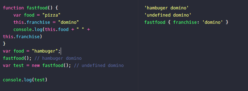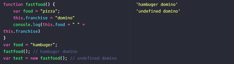 결과를 보면 알겠지만, 이제 new fastfood() 객체에는 franchise값만을 가지고 있고, console.log() 안의 this.food는 참조할 수 없는 상태다. 따라서, this로 접근한 franchise는 정상적으로 값을 출력하고 있고, food는 더 이상 전역 객체가 아니므로 undefined를 반환하게 된다.