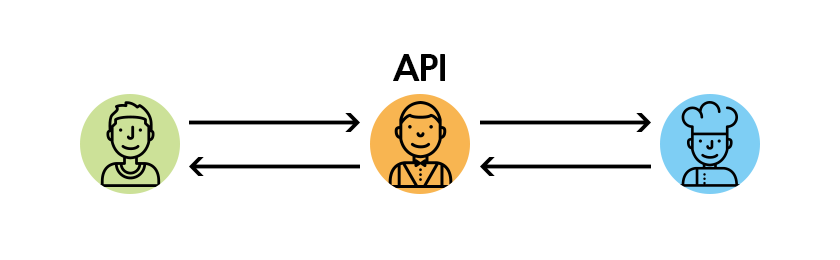 언제나 그랬듯 알기쉽게 예시를 들어보겠다. 우리가 식당에 가면 홀에서 서빙하는 직원이 메뉴판을 가져다 준다. 그 메뉴판을 통해 음식을 정하여 점원을 통해 주문을 하게 되면, 점원은 주방 요리사에게 주문내용을 전달하게 된다. 주문을 받은 요리사는 그 즉시 요리를 시작할 것이고, 요리가 완성되면 다시 점원을 통해 요리를 전달받고 비로소 먹을 수 있게 된다. 즉, API는 프로그램과 프로그램이 서로 상호작용할 수 있도록 도와주는 매개체다.