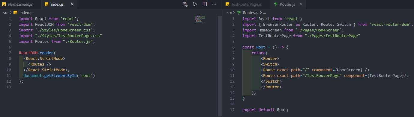예제 파일에 HomeScreen, TestRouterPage라는 컴포넌트를 생성했다. 각각의 컴포넌트에는 특별한 기능 없이 테스트 문구만 적용한 상태이며, CSS파일엔 텍스트 색상만 변경해두었다.