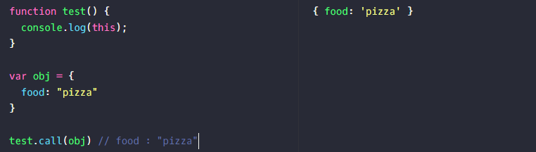 디버깅 창을 보면 알다시피, call함수를 사용하여 바인딩할 객체를 명시하고 있다. 이렇게 하여 test함수를 실행하게 되면, this는 전역 객체를 기본 바인딩하지 않고 obj 객체를 바인딩하여 this는 pizza의 값을 가지게 된다.